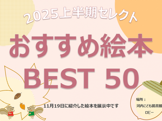 11月19日(水)開催の 『2025年上半期セレクト おすすめ絵本 BEST 50』 行事で紹介した絵本を展示しています。 ※ 絵本リストはイベント限定配布のためご用意がありません。 ご了承ください。