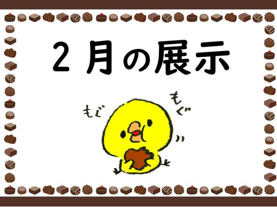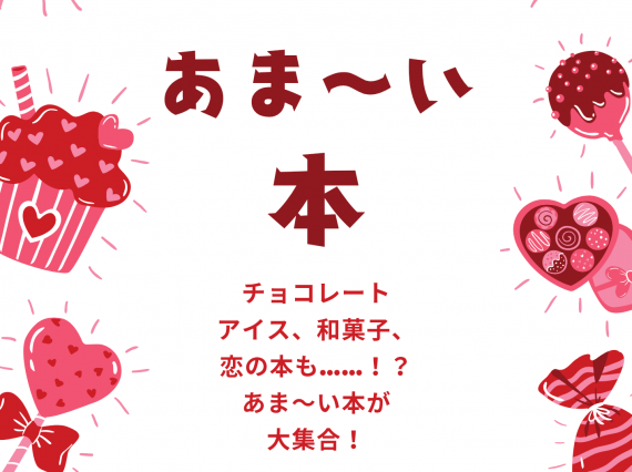 2月の展示 【あま~い本】 チョコレートをはじめとしたいろいろなお菓子の本や 恋の本も……!? あま~い本を集めました。 図書館入口に展示しています。