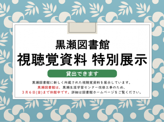 黒瀬図書館に新しく所蔵された視聴覚資料を展示しています。 黒瀬図書館は、黒瀬生涯学習センター改修工事のため、 3月6日(金)まで休館中です。詳細は図書館ホームページをご覧ください。