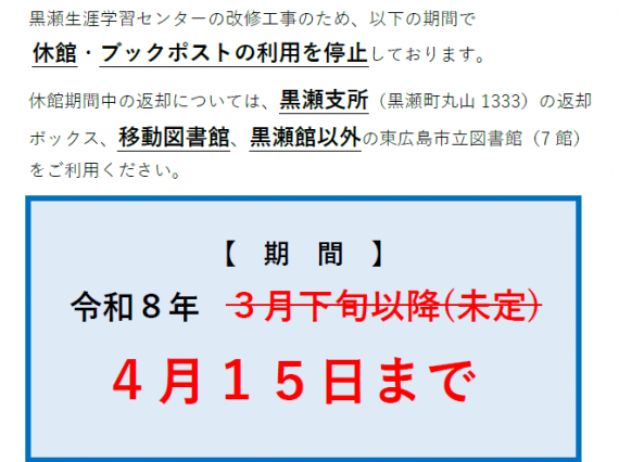 4月16日(木)より、黒瀬図書館の一部サービスを再開いたします。 (令和7年12月15日(月)~令和8年4月15日(水)まで工事の影響により、完全休館いたしました。) なお、完全開館は令和8年8月を予定しております。 ご […]