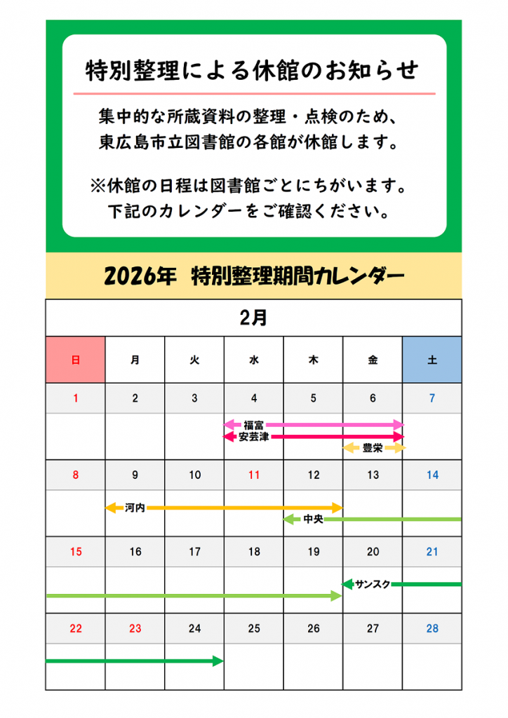 集中的な所蔵資料の整理・点検を行うため、以下の日程で各館を休館いたします。