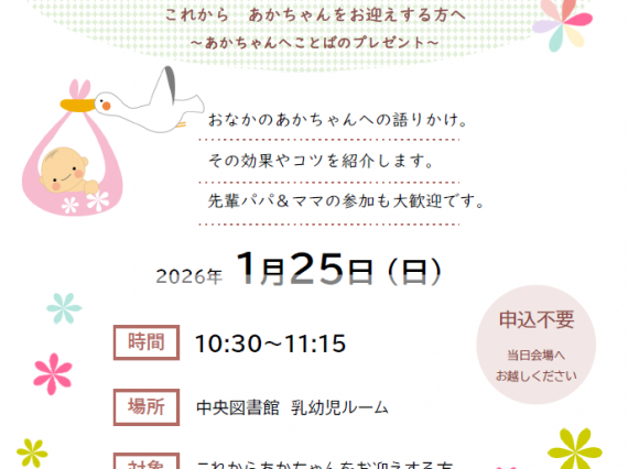 これからパパになる、ママになる、あかちゃんを迎えるご家族の方へ。 おなかのあかちゃんへの語りかけの効果やコツを紹介します。 妊婦さんやそのパートナー、家族のみなさん、 先輩パパ・ママも一緒に参加いただけます。 ポスター( […]
