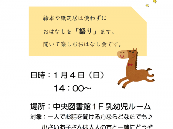 絵本や紙芝居を使わず、「語り」でお話するストーリーテリングのおはなし会です。 ポスター