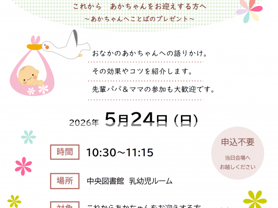 (病気・絵本・育児・あそび・食などの本を集めて展示します) 本の貸出・相談・案内など 気軽に声をかけてくださいね! 希望者には、絵本コーナーにて読み聞かせを行います。