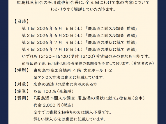 広島杜氏組合の石川達也組合長に『廣島酒ニ關スル調査 廣島酒の現状に就て』復刻版(合本)の内容についてわかりやすく解説していただきます。