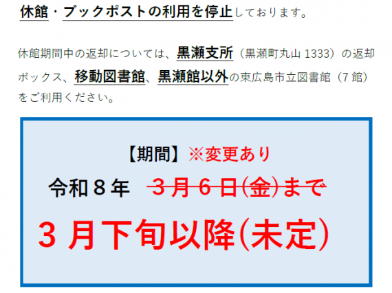 【黒瀬】休館・ブックポスト利用停止のお知らせ 令和7年12月15日(月)〜令和8年3月下旬以降 ※2月12日 更新