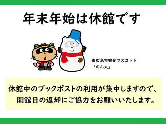 年末年始は以下の通り全館休館いたします。 期間中に返却が集中するとブックポストがあふれたり、資料が破損したりする恐れがあります。 休館期間をはさむ場合、貸出期間が通常より長くなっておりますので、窓口での返却にご協力をお願 […]