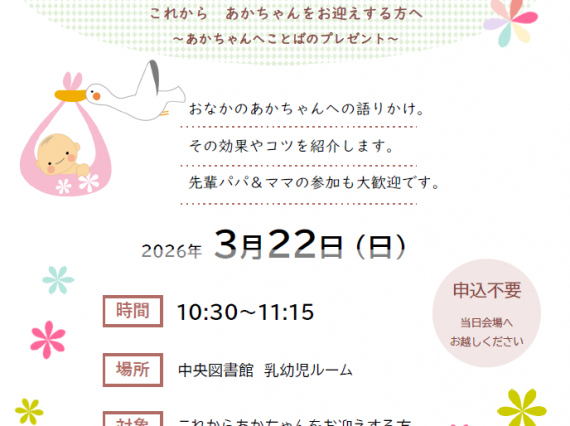 これからパパになる、ママになる、あかちゃんを迎えるご家族の方へ。 おなかのあかちゃんへの語りかけの効果やコツを紹介します。 妊婦さんやそのパートナー、家族のみなさん、 先輩パパ・ママも一緒に参加いただけます。 ポスター( […]