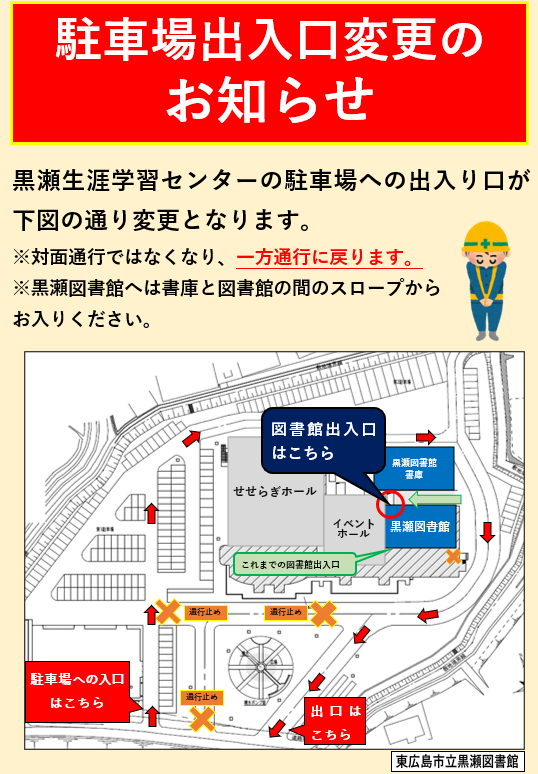 【黒瀬】黒瀬生涯学習センター駐車場出入口変更について ※4月15日 更新