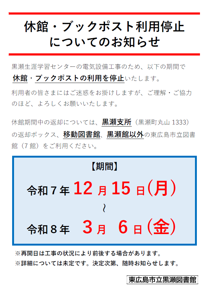 【黒瀬】黒瀬図書館休館・ブックポスト利用停止のお知らせ