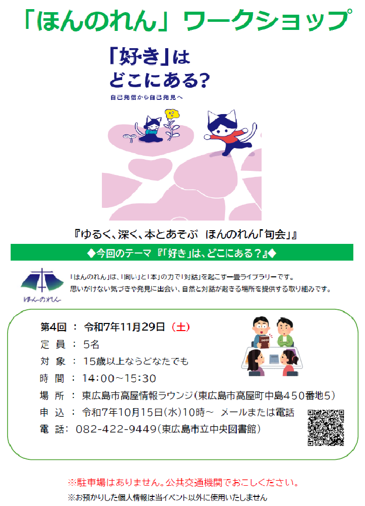 申込 | 10月15日(水)10:00~ 電話またはメール TEL:082-422-9449(中央図書館) メール:volunteer.tak▲libra.city.higashihiroshima.hiroshima.jp ※スパムメール対策のため、「▲」を「@」に変えてお送りください。 |