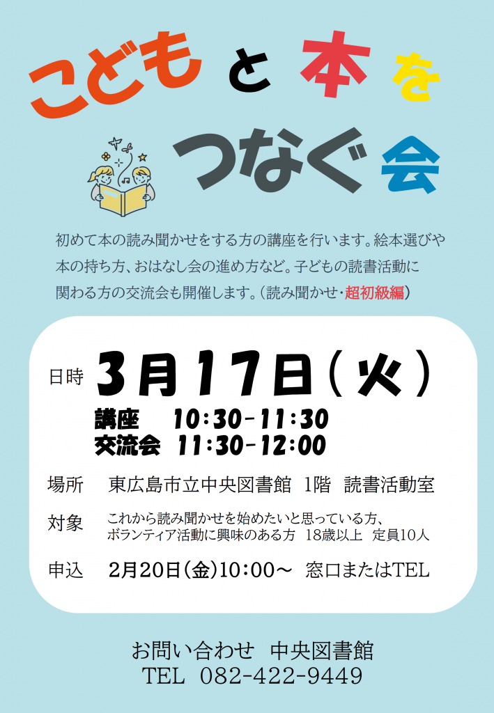 対象/定員 絵本の読み聞かせやボランティア活動をこれから始めようと考えている人 /18歳以上 10名(先着順)