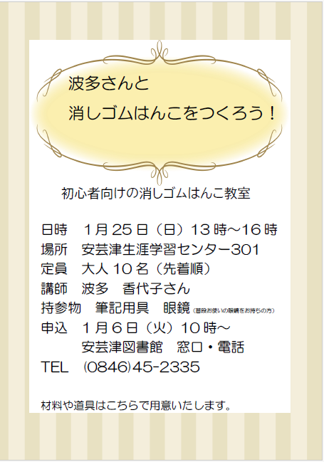 | 申込 | 窓口または電話(1/6(火)10:00~受付) |