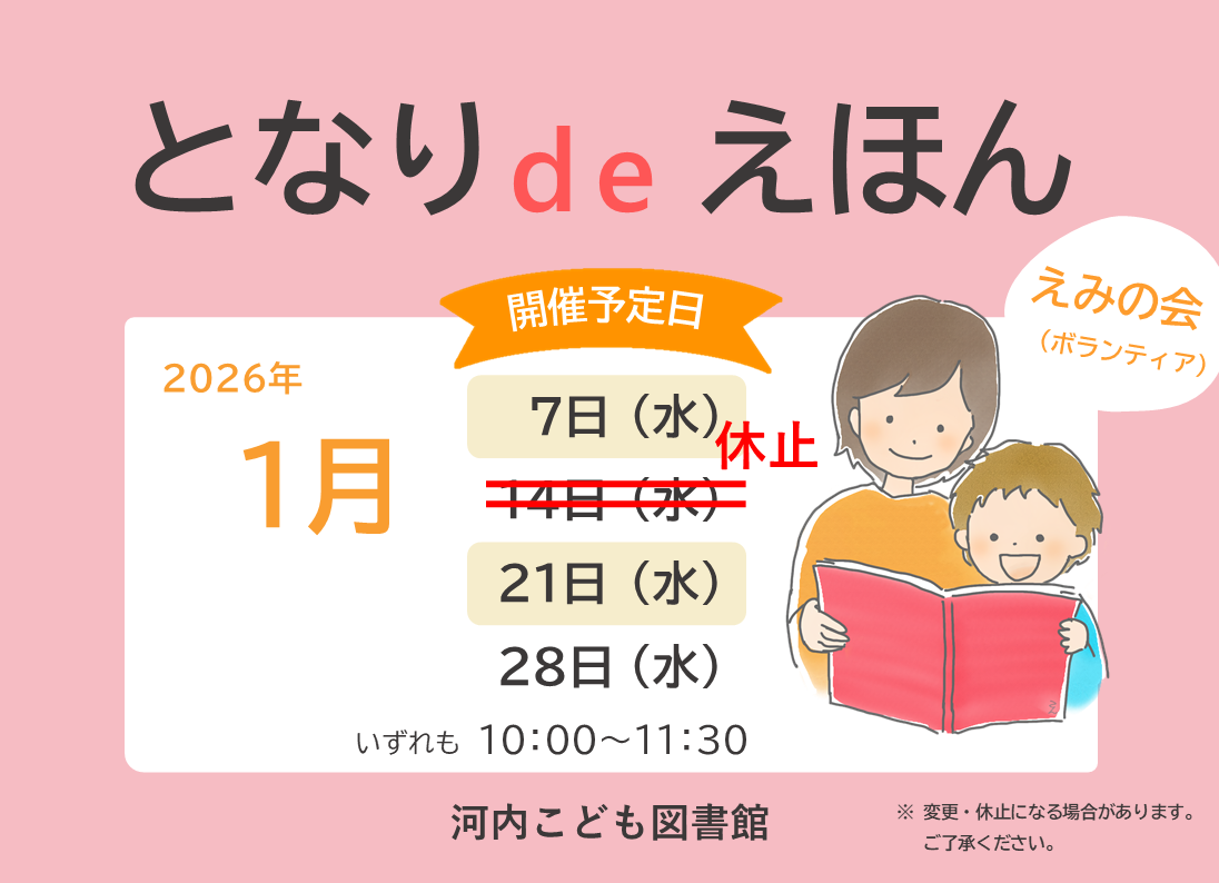 ※1月13日 追記※ 1月14日(水)開催予定の『となり de えほん』は都合により休止いたします。 みなさまには大変ご迷惑をおかけしますが、ご了承ください。