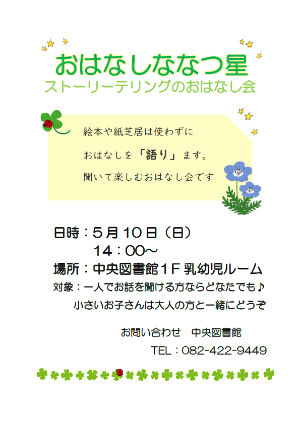 絵本や紙芝居を使わず、「語り」でお話するストーリーテリングのおはなし会です。