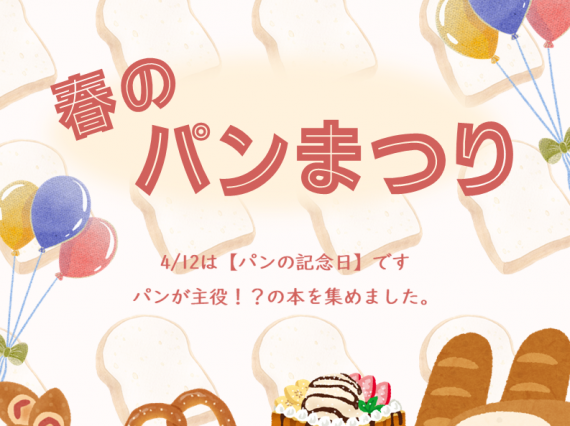 4月の展示 【春のパンまつり】 4/12はパンの記念日です。 パンが主役!?の本を集めました。 図書館入口に展示しています。