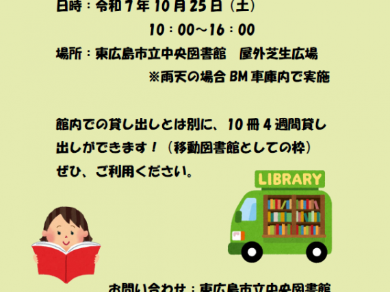 市内32か所のステーションを月1回程度のペースで巡回しています。ぜひご利用ください。 また、出張所に返却された本の回収日も地域ごとに掲載しています。 2025年10月 information 西条 八本松 志和 高屋 黒 […]