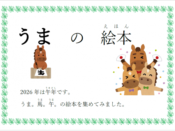 1月のテーマ 「うまの絵本」 2026年は午(うま)年(どし)です。 うま。馬(うま)。午(うま)。の絵本を集めてみました。 &nbs […]
