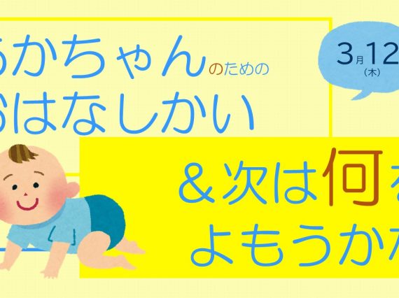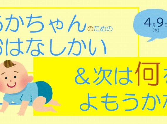 あかちゃんと一緒に絵本や手遊びで楽しみましょう。 さらに、赤ちゃんを卒業する頃はどのような絵本を選書したらよいか、 次のステップへの絵本紹介を行います。 ・参加当日はご自宅で検温の上ご参加ください。